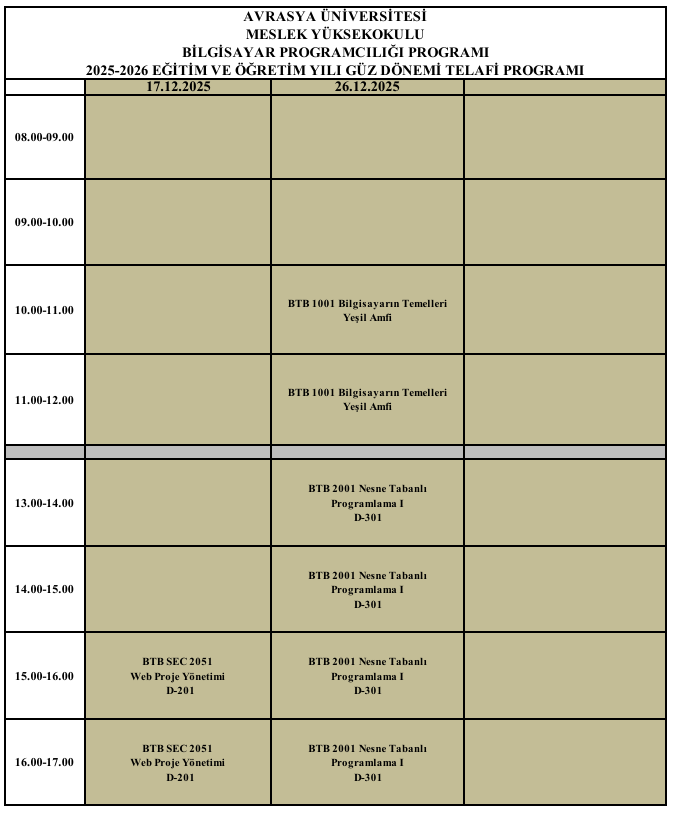 2025-2026 Güz Dönemi MYO Bilgisayar Programcılığı Yılbaşı Telafi Programı