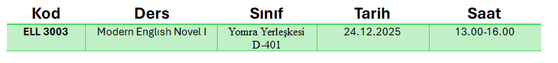 ELL 3003 – Modern English Novel I dersi için 20.12.2025 tarihinde 09:00–16:00 saatleri arasında yapılması planlanan telafi dersi aşağıdaki tabloda belirtilen gün ve saatte yapılacaktır.