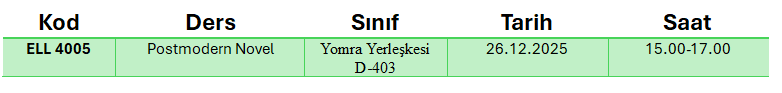 21.11.2025 tarihinde yapılamayan ELL 4005 Postmodern Novel dersinin telafisi aşağıdaki tabloda belirtilen gün ve saatte yapılacaktır.