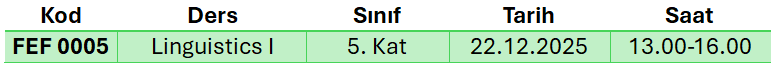FEF 0005 kodlu Linguistics I dersine ait telafi programında 27.12.2025 tarihinde yapılması planlanan telafi dersi, 22.12.2025 tarihine alınmış ve aşağıdaki tabloda güncel hali paylaşılmıştır.