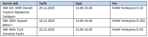 4.12.2025 ve 5.12.2025 tarihlerinde işlenemeyen derslerin telafisi, tabloda belirtilen gün ve saatlerde yapılacaktır. Bilgilerinize rica olunur.