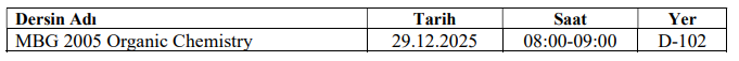 2005 Organic Chemistry dersinin telafi programı aşağıdaki tabloda belirtilmiştir.