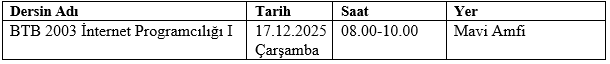 BTB 2003 İnternet Programcılığı I dersinin telafi programı aşağıdaki tabloda paylaşılmıştır. Telafi programı 31.12.2025 tarihleri arasında yapılamayan dersi kapsamaktadır.