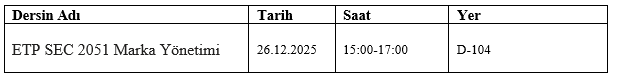02.01.2026 tarihinde yapılamayacak olan ETP SEC 2051 Marka Yönetimi dersinin telafisi aşağıdaki tabloda belirtilen tarih ve saatte yapılacaktır.