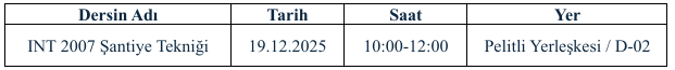 “02.01.2026 tarihinde yapılacak olan “INT 2007 Şantiye Tekniği” dersiniz yapılmayacak olup,
