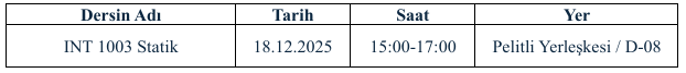 “02.01.2026 tarihinde yapılacak olan “INT 1003 Statik” dersiniz yapılmayacak olup, aşağıdaki tabloda belirtilen tarih ve saatte telafisi yapılacaktır. Bilgilerinize.