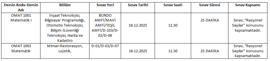 OMAT 1001 Matematik I ve OMAT 1003 Matematik dersleri için Kısa Süreli Sınav (Quiz) yapılacaktır. Yapılacak sınav ile ilgili bilgiler aşağıda verilmiştir.