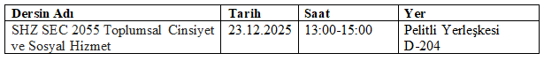 SHZ SEC 2055 Toplumsal Cinsiyet ve Sosyal Hizmet dersinin telafi Aşağıdaki tabloda paylaşılmıştır. Telafi programı 03.10.2025 tarihinde yapılamayan dersi kapsamaktadır.