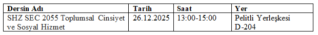 SHZ SEC 2055 Toplumsal Cinsiyet ve Sosyal Hizmet dersinin telafi Aşağıdaki tabloda paylaşılmıştır. Telafi programı 02.01.2025 tarihinde yapılamayan dersi kapsamaktadır.