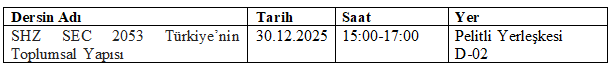 SHZ SEC 2053 Türkiye’nin Toplumsal Yapısı dersinin telafi Aşağıdaki tabloda paylaşılmıştır. Telafi programı 31.12.2025 tarihinde yapılamayan dersi kapsamaktadır.
