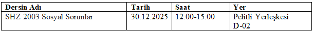 SHZ 2003 Sosyal Sorunlar dersinin telafi Aşağıdaki tabloda paylaşılmıştır. Telafi programı 31.12.2025 tarihinde yapılamayan dersi kapsamaktadır.