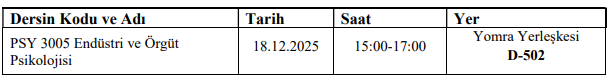 01.01.2026 Perşembe günü olan PSY 3005 Endüstri ve Örgüt Psikolojisi dersinin telafi programı