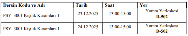 30.12.2025 Salı günü ve 31.12.2025 Çarşamba günü olan PSY 3001 Kişilik Kuramları-1 dersinin