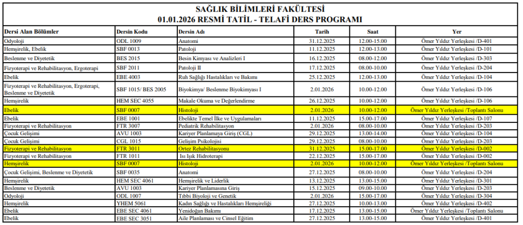 SBF – Resmi Tatil (01.01.2026) Kapsamında Telafi Edilecek Dersler Hk. (Güncel)