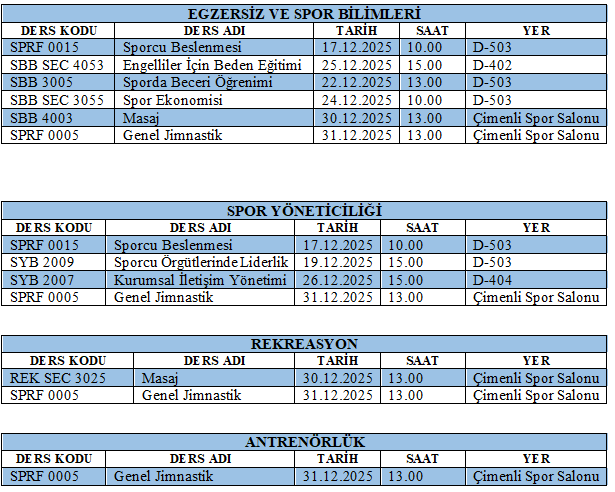 Spor Bilimleri Fakültesi 1 Ocak Resmi Tatile Denk Gelen Dersler İçin Telafi Programı