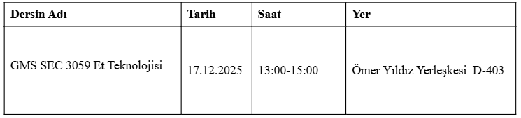 18.12.2025 tarihinde ki “GMS SEC 3059 kodlu Et Teknolojisi” dersi işlenemeyeceğinden , ilgili dersin telafisi tabloda belirtilen gün ve saatte yapılacaktır. Bilgilerinize rica olunur.