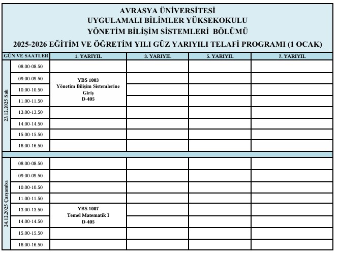 UBYO – Resmi Tatil (01.01.2026 ) kapsamında Telafi Edilecek Dersler Hk.