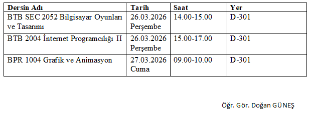 23.03.2026 tarihinde yapılamayan ilgili derslerin telafi programı aşağıdaki tabloda paylaşılmıştır. Bilgilerinize.