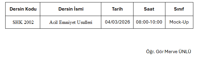 19/03/2026 tarihinde saat 13:00’de gerçekleştirilecek olan ACİL EMNİYET USULLERİ dersinin telafisi 04/03/2026 tarihi saat 08:00-10:00 arasında MOCK-UP sınıfında gerçekleştirilecektir.