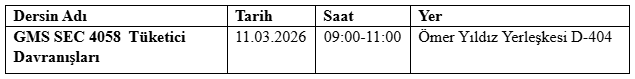 19.03.2026 tarihinde ki “GMS SEC 4058 Kodlu Tüketici Davranışları ” dersi işlenemeyeceğinden , ilgili derslerin telafisi tabloda belirtilen gün ve saatte yapılacaktır.