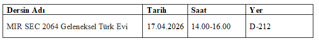 “MIR SEC 2064 Geleneksel Türk Evi” dersi “10.04.2026” tarihinde yapılamayacak olup, aşağıdaki tabloda belirtilen tarih ve saatte telafisi yapılacaktır. Bilgilerinize.