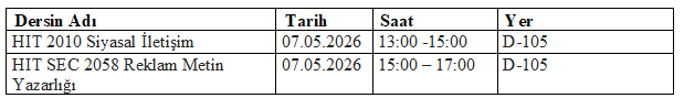 21.03.2026 tarihinde yapılamamış olan derslerin, aşağıdaki tabloda belirtilen tarih ve saatte telafisi yapılacaktır. Bilgilerinize.