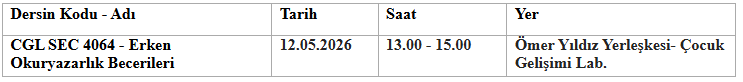 22.04.2026 tarihinde aşağıda belirtilen ders yapılmayacak olup, ilgili dersin telafisi tabloda belirtilen gün ve saatte yapılacaktır.