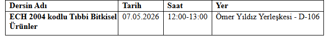30.04.2026 tarihindeki “ECH 2004 kodlu Tıbbi Bitkisel Ürünler” dersi işlenemeyeceğinden, ilgili dersin telafisi tabloda belirtilen gün ve saatte yapılacaktır.