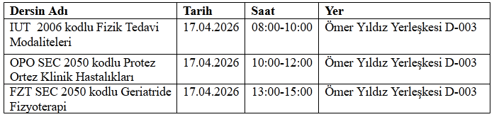 07.04.2026-10.04.2026tarih aralığında ki “IUT  2006 kodlu Fizik Tedavi Modaliteleri, OPO SEC 2050 kodlu Protez Ortez Klinik Hastalıkları ve FZT SEC 2050 kodlu Geriatride Fizyoterapi” dersleri işlenemeyeceğinden  , ilgili derslerin telafisi tabloda belirtilen gün ve saatte yapılacaktır.